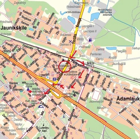 ♦ 1.darba zona – ielas rekonstrukcijas darbus plānots veikt no 1.04. līdz 30.05. Ceļa posms no dzelzceļa pārbrauktuves līdz Dainu ielas krustojumam. (1.att.) Paralēli darbiem galvenajā zonā tiks veikta Skolas ielas rekonstrukcija posmā Rīgas – Daugavpils šosejas nobrauktuve līdz Birzes ielas krustojumam (2.att.), kā arīSkolas ielas posms pie Pārbrauktuves ielas krustojuma (līdz dzelzceļam- 3.att.)