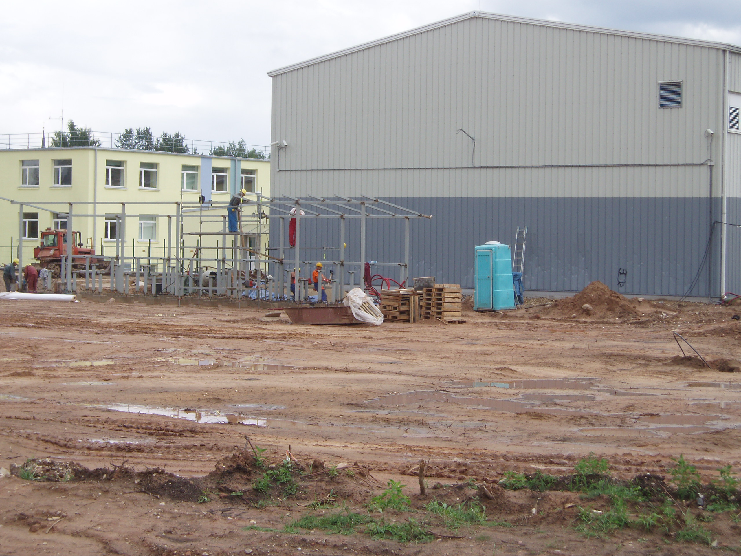 Stadionā tiek būvētas tribīnes. Nelielas tribīnes parasti izvieto stadiona centrā (tur ir uzstādīts pelēka skārda klucis – inventāra noliktava) vai skriešanas disciplīnu finiša zonā. Šīs ir skrejceļa otrā galā, ja vien Ikšķilē nav plānots vieglatlētikas apvērsums… Ja nu tiešām tribīnes bija jāliek pie sporta zāles, tad ir grūti saprast, kādēļ tās nevarēja izvietot tieši pretī sporta zāles galam? Tad teritoriju starp tribīnēm un sporta zāli varētu nosegt ar vieglu jumta konstrukciju, par niecīgu samaksu dubultojot stadiona apjumto daļu? Varbūt vaina atkal ir kādā šķērslī – šeit redzama strādnieku pārvietojamā tualete?