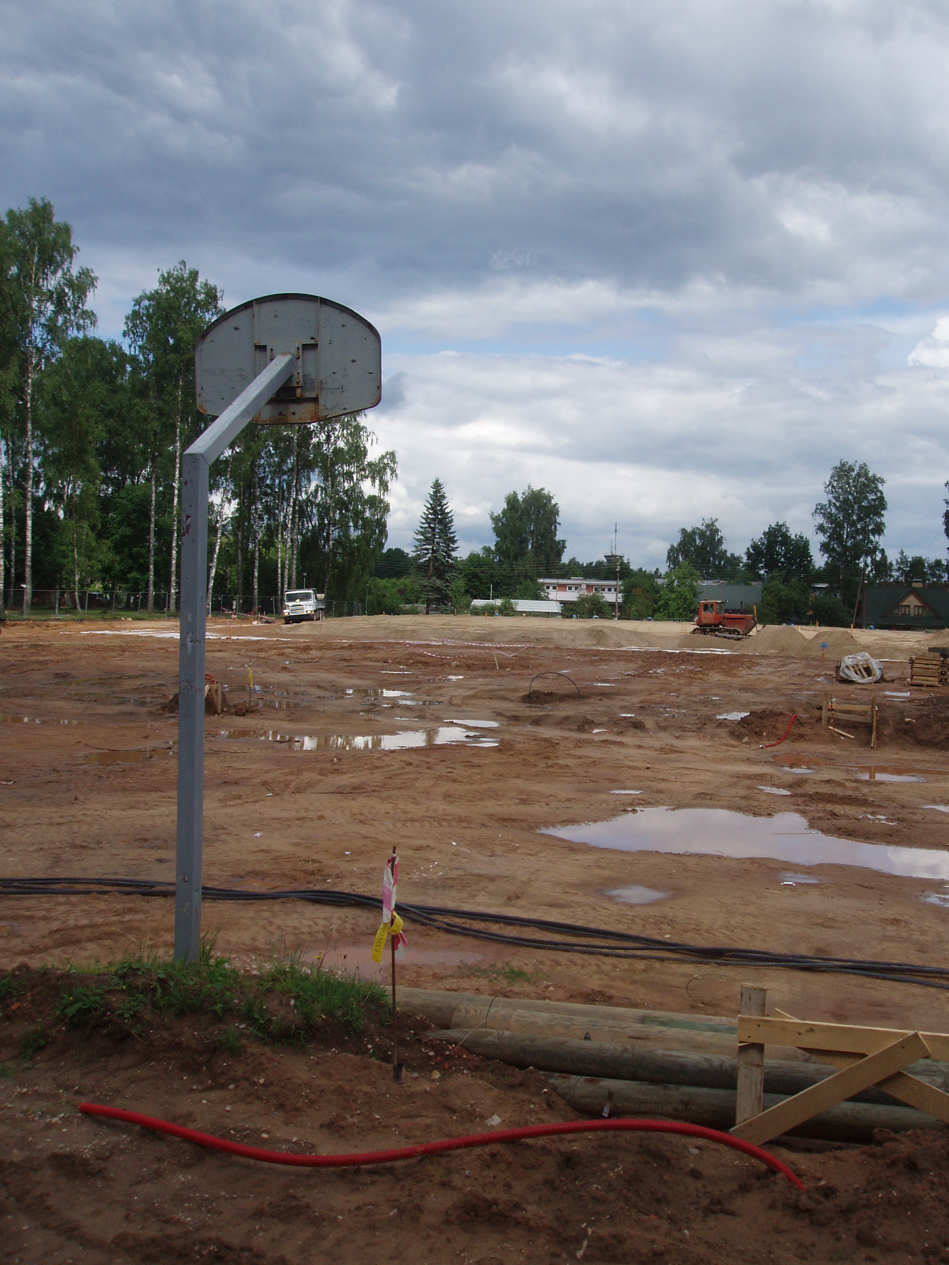 Stadiona galā ir atstāts viens no 4 vecajiem basketbola groziem. Ja stadionu būvē apkārt atkritumu konteineriem un, iespējams, strādnieku tualetēm, tad šeit jau gandrīz droši var pieņemt, ka tieši pēc šī groza tiks marķēti basketbola laukumi – to seguma augstums zem groza stīpas un līniju izvietojums. Bet basketbola laukumi projektā atrodas citā vietā. Šis būtu joks, ja stadionā otrā galā nebūtu speciālā izbūve atkritumu konteineriem.