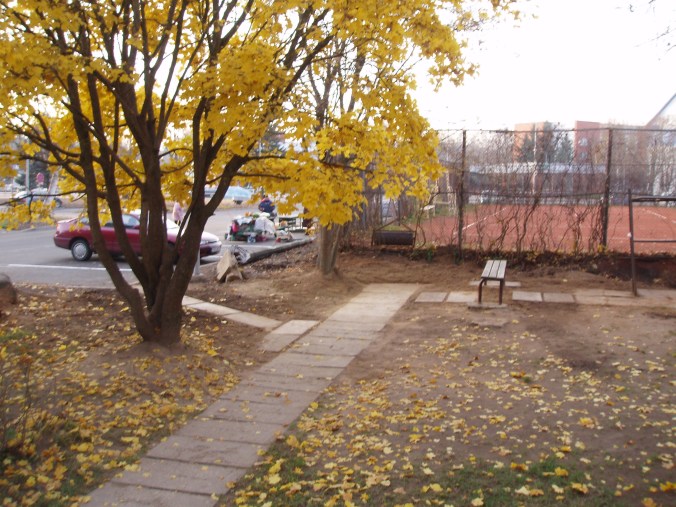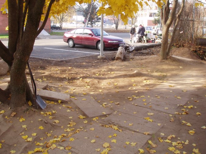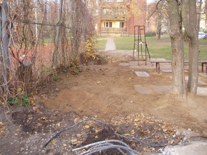 Agrākā celiņa vietā bedres un izmētātas seguma plāksnes, vecs apgaismes stabs un svaiga melnzeme ar zāles sēklām. Jums nebūs te staigāt!
